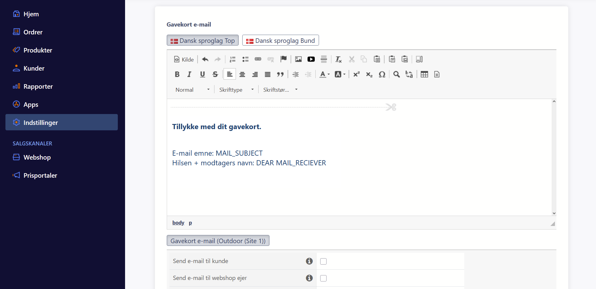Bemærk: Ovenstående gælder kun gavekort, der er oprettet som et Gavekortprodukt. Shoppen genererer automatisk gavekortkoden og tilføjer den til mailen (se mere om gavekort e-mail i afsnittet herunder).
