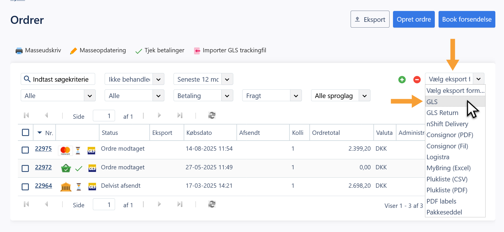 Når en eller flere ordrer er markeret, klikker du på dropdown listen Vælg eksport format og vælger GLS, som vist tidligere under opsætning af GLS i shoppen: