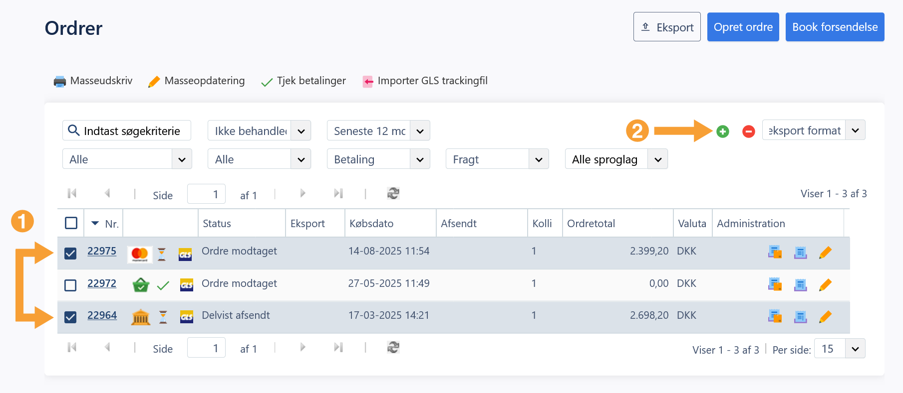 Når en eller flere ordrer er klar til at blive pakket og sendt, sætter du et flueben ud for de ordrer som skal have en pakkelabel. Herefter klikker du på det grønne plus over ordrelisten (som vist herunder) hvilket markerer ordrerne til at blive eksporteret til GLS: