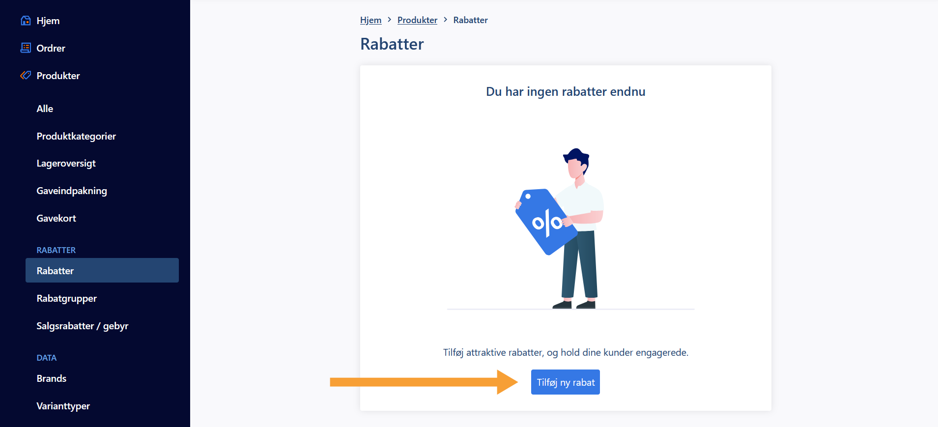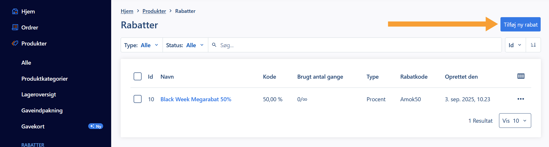 Opret rabatkoder til kampagner, udsalg, nye kunder eller kundeklubber. Via menupunktet Rabatter, som du finder under Produkter > Rabatter i venstremenuen, er det muligt at konfigurere rabatkoder, som kan indløses når man lægger en ordre i shoppen: