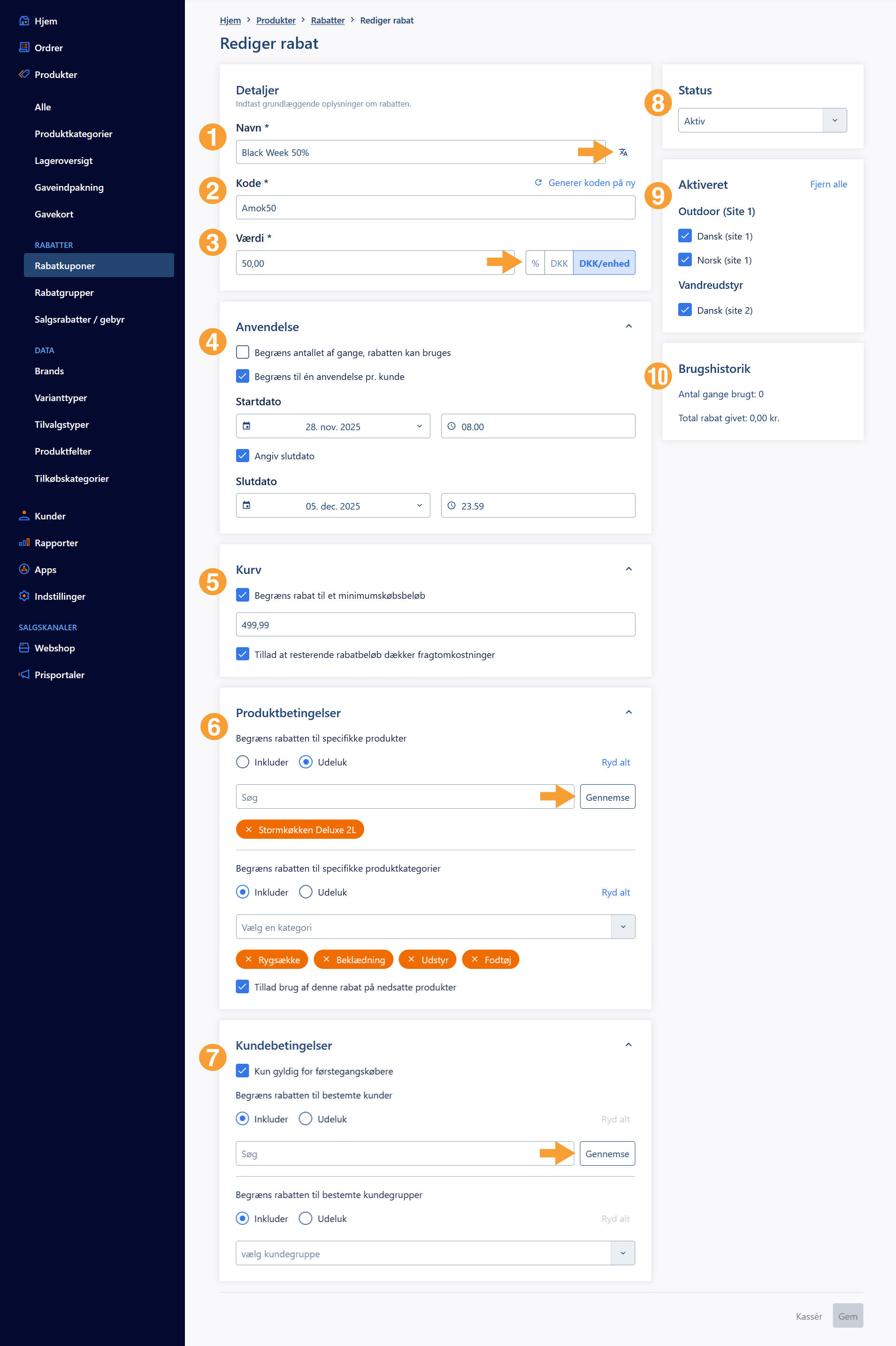 Navn: Navngiv din rabat med en titel, som giver mening for dig og dine kunder. Dermed kan du også lettere skelne dine rabatter fra hinanden i administrationen. Navnet på rabatten vises i kurven som ordrelinje når koden er indtastet.