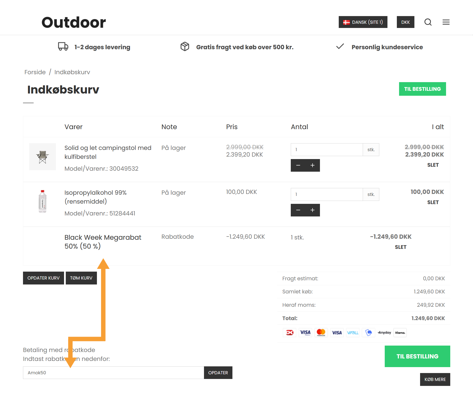 Bemærk: Den samme rabatkode kan kun indløses 1 gang pr. ordre selv om den ikke er begrænset til antal gange. Så man kan altså ikke indtaste koden gentagne gange på samme ordre. Det er muligt, at kombinere rabatkoder med gavekort på den samme ordre.