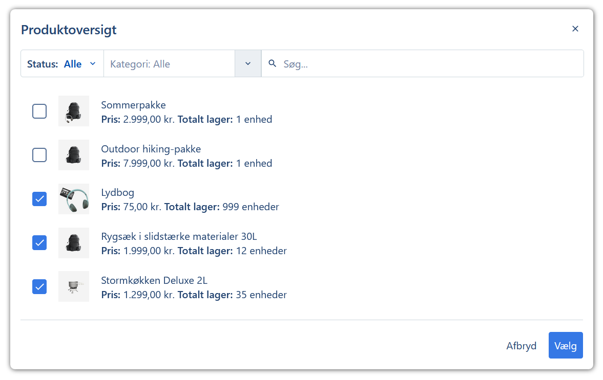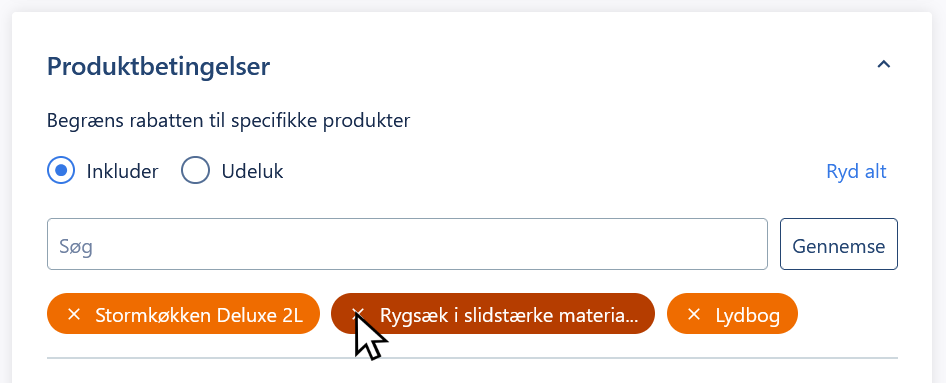 Bemærk: Produkter, som enten er inkluderet eller udelukket kan fjernes igen ved, at klikke på dem i oversigten: