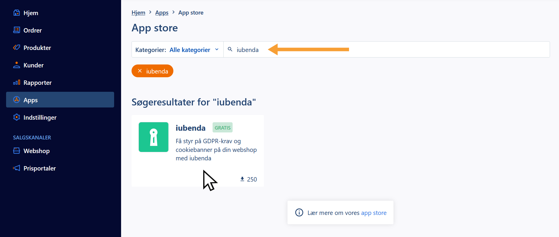Gå til Apps > Besøg app store og søg på iubenda: