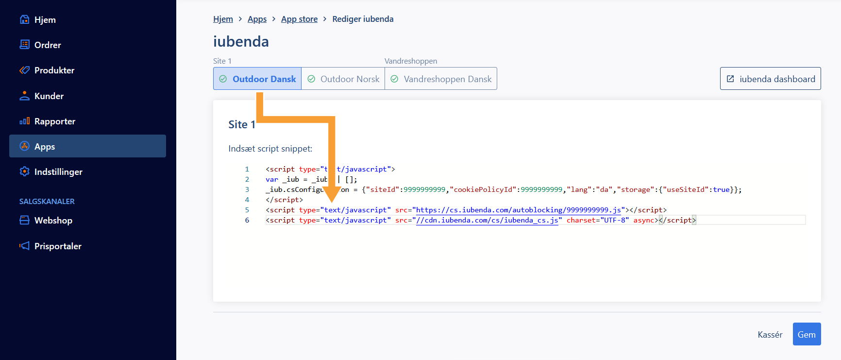 WayWidget aktiveres på dit domæne i iubendas administration, hvorefter integrationskoden kopieres og indsættes i webshoppens administration:
